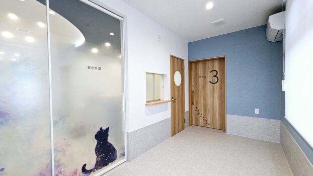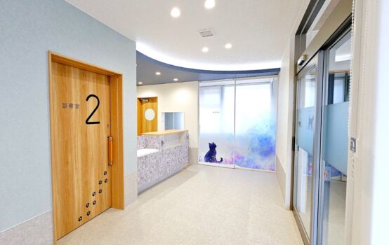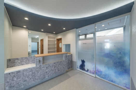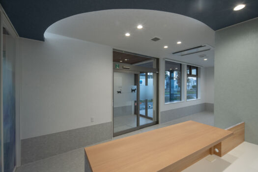 待合室は、受付前で、ガラスの扉で犬と猫の部屋を分けた計画になっておいます。